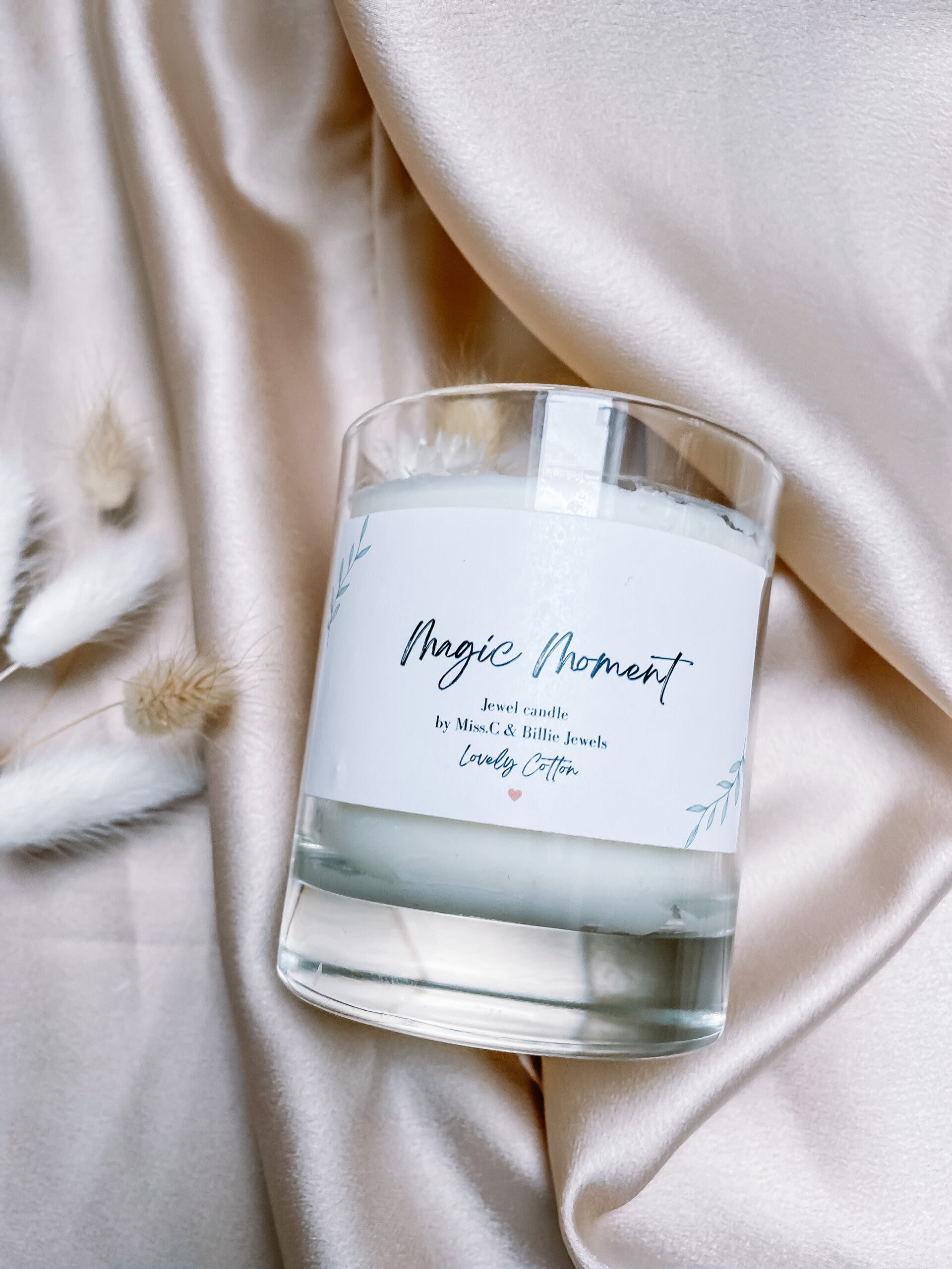 Miss C en Billie Jewels stellen hun " magic jewel candle" voor. Een magische beleving waar je urenlang kan genieten van de gezelligheid van een prachtige kaars met de heerlijke "lovely cotton" geur en bovenop wordt verrast door een prachtig gouden juweeltje.