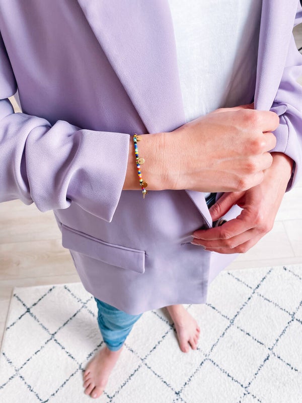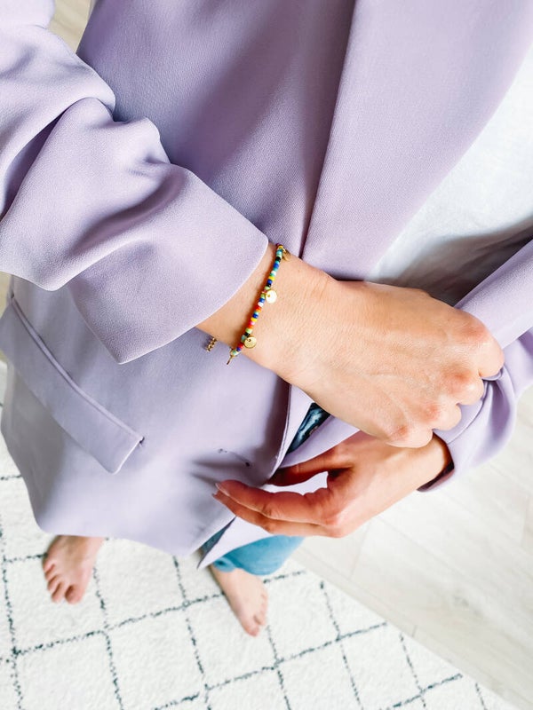 Gekleurde armband met kraaltjes, gouden afwerking in stainless steel.