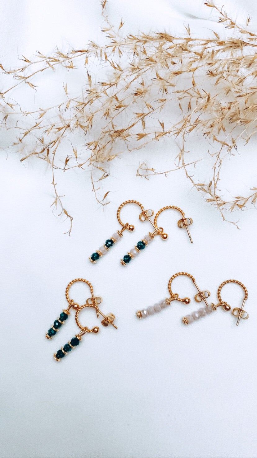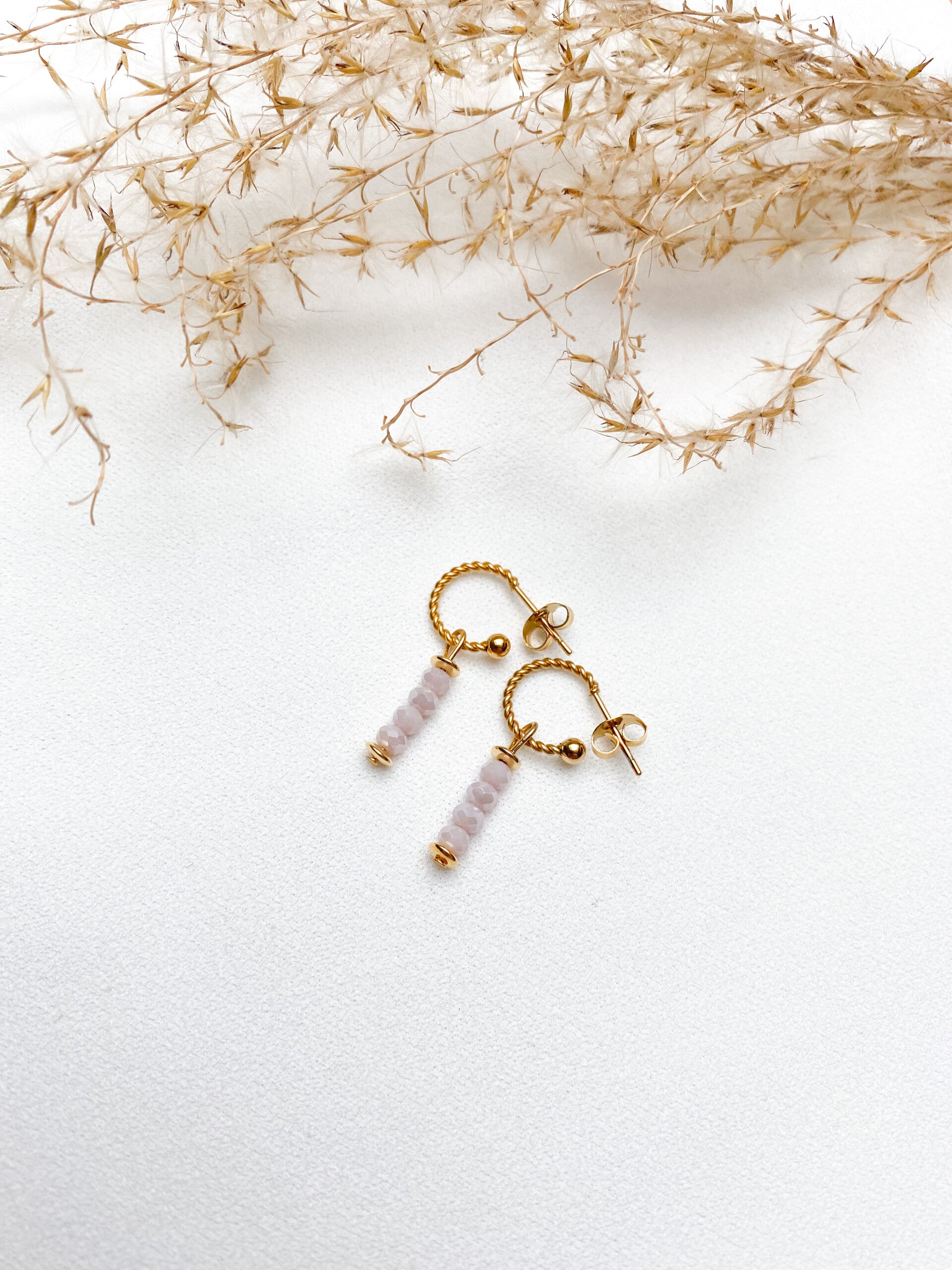 Mooie gouden gedraaide creool afgewerkt met mini lilakleurige facet kralen.