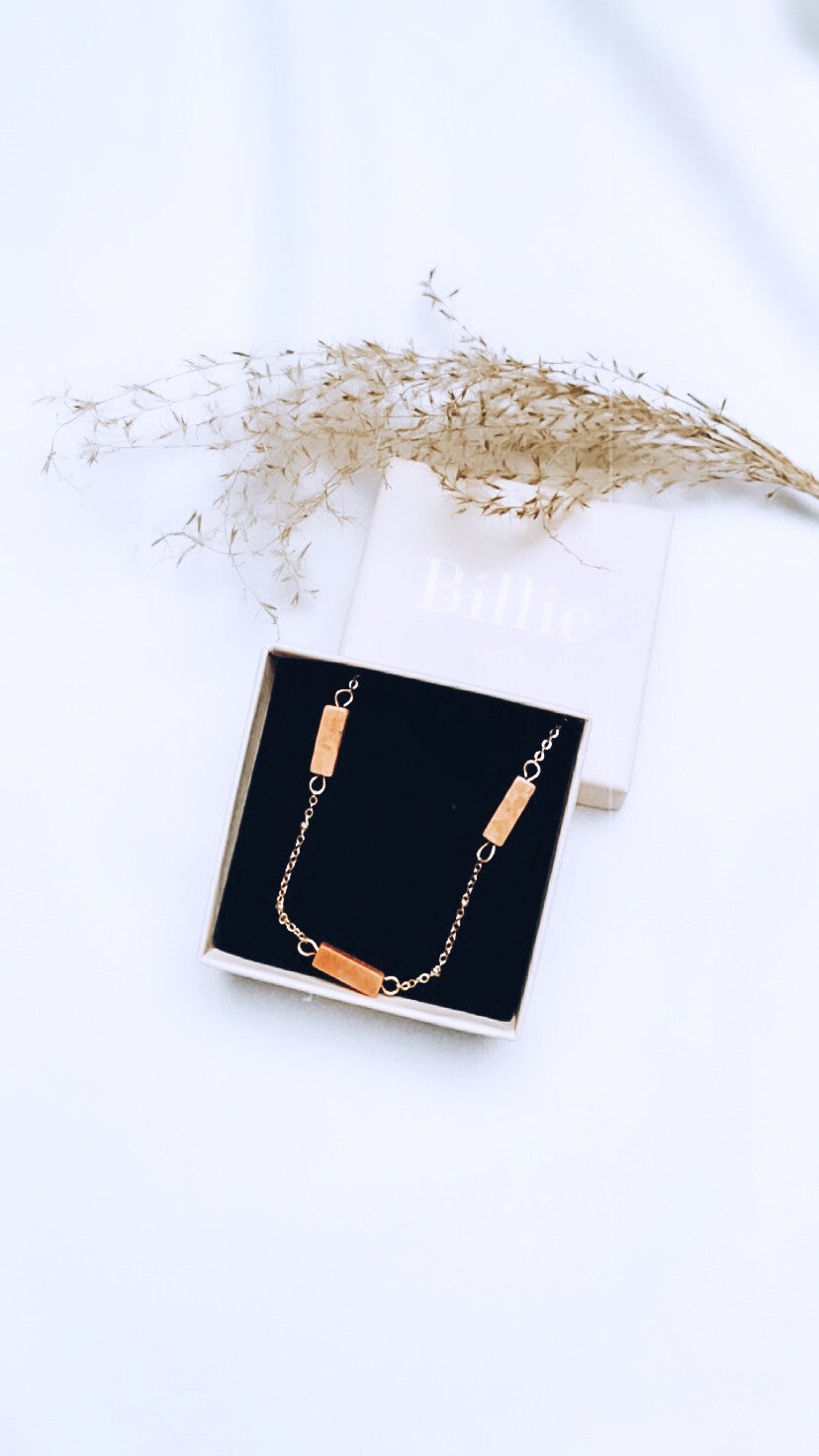 Prachtige ketting met zalm kleurige natuursteen hangertjes.Vrouwelijk en elegant.