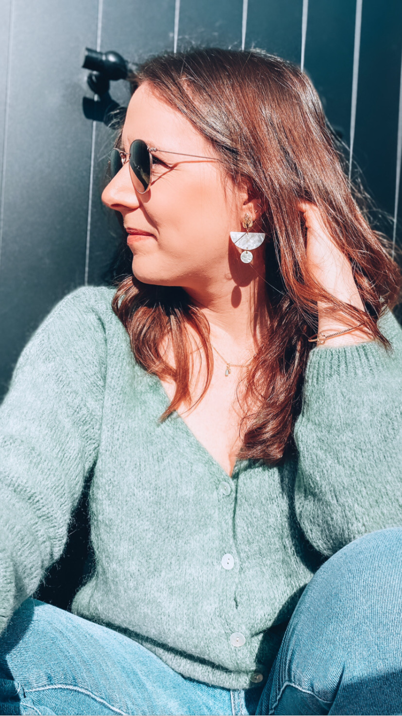 Losse mouwen met vaster stukje aan de pols wat het modelletje los maar elegant maakt. V- hals gilet model met mooie parelmoer knopen.
