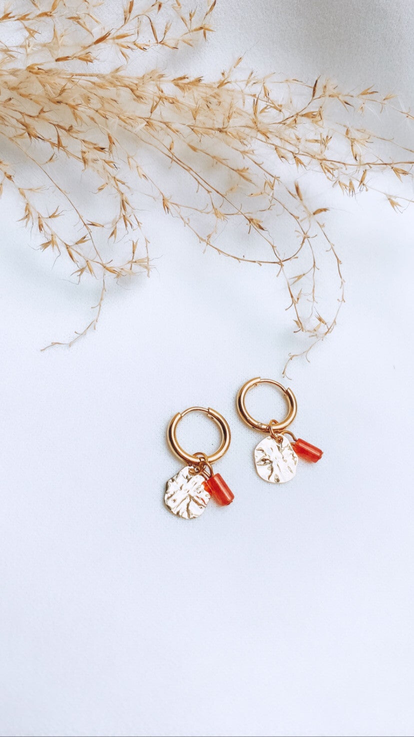 Handgemaakte goudkleurige oorbel met natuursteen hangertje.