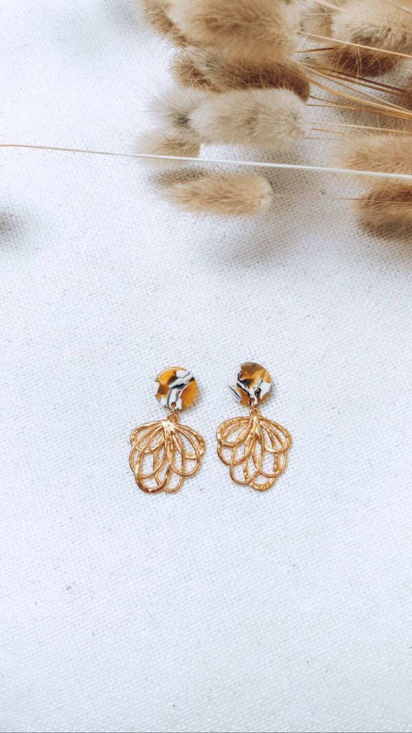 Handgemaakte goudkleurige oorbel. Prachtig gele stekers afgewerkt met goude bedel.