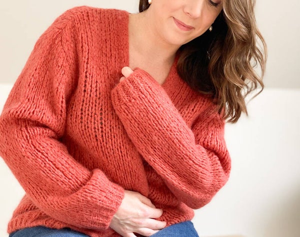 Losse mouwen met vaster stukje aan de pols wat het modelletje los maar elegant maakt. V- hals gilet model met mooie parelmoer knopen.